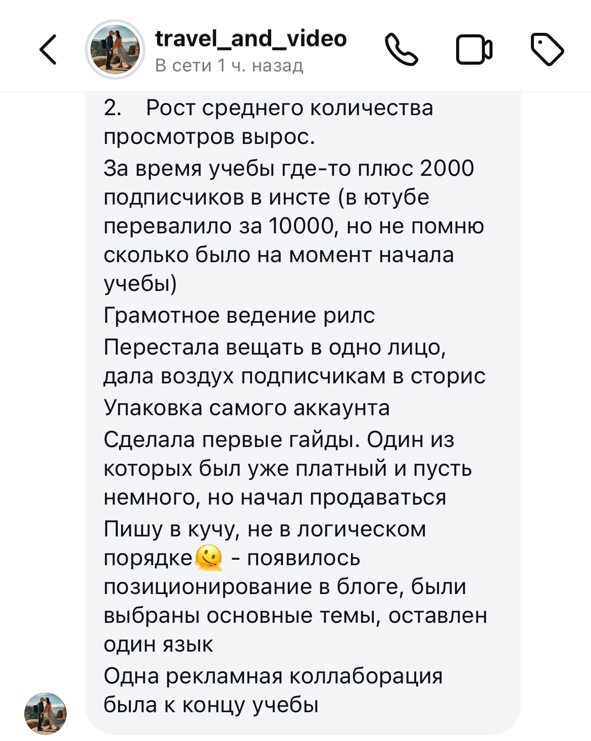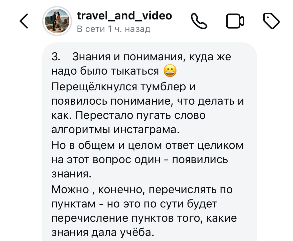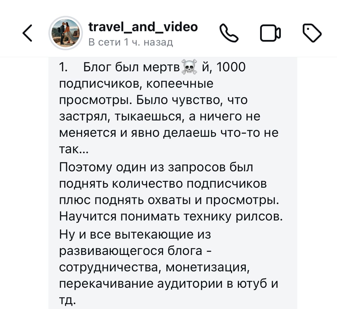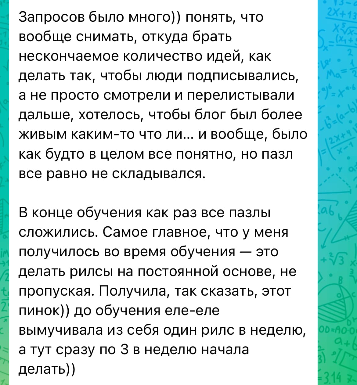Поняла свои ошибки, определила тему, решила проблему с идеями, выпустила вирусные рилс, аудитория набирается